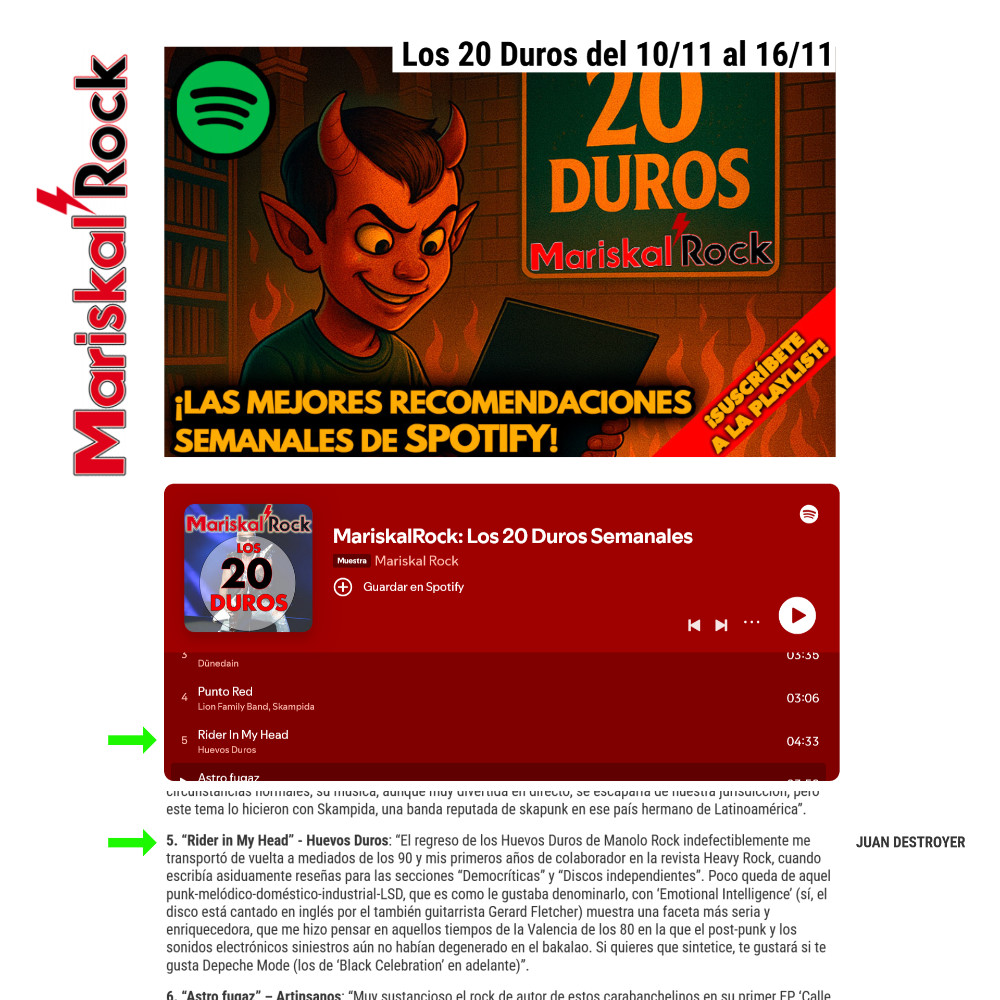 ¡Siembra cariño y recibirás amor! Muy contento del trato que le están dando a Emotional Intelligence en la mayoría de los medios. Juan Destroyer de MariskalRock Radio ha metido esta semana "Rider In My Head" en la lista Los 20 Duros, mis paisanos de Sancocho.com se hacen eco del lanzamiento del disco, José Gálvez desde su Nacional Pop pincha "You" y Leo Cebrián en Los Mejores Rock hace un balance con los pecados capitales de los primeros Huevos Duros. ¿Qué más se puede pedir?